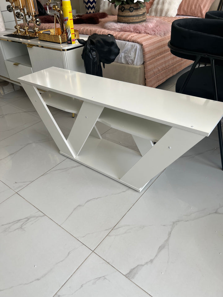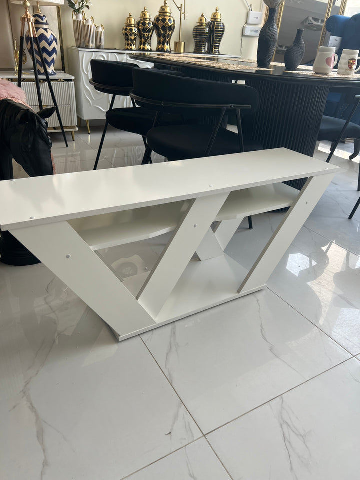 A striking and bold design makes this TV stand as an eye-catching focal point for a living space. It is made from manufactured wood with a solid-colour design, and it has two open shelves. The upper surface of this unit can accommodate televisions up to 50 inches in size. It is available in many finishes from neutral to vibrant and colourful. Assembly is required.