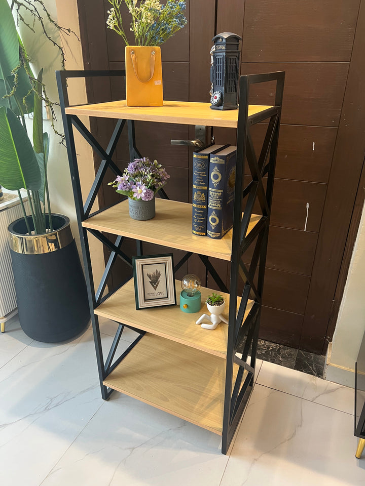 This stylish bookcase offers four open MDF sheet shelves that fit neatly with the Black metal frame supports.