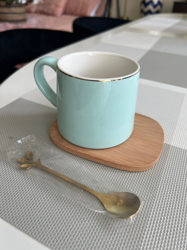 Material: Ceramic Mug, Wooden Coaster and metal spoon