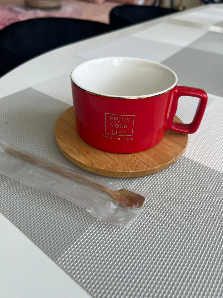 Material: Ceramic Mug, Wooden Coaster and metal spoon