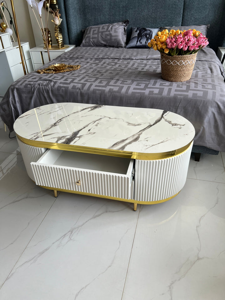 Material: MDF wood with UV sheet on top. Gold metal legs